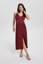 Şarap kırmızısının Viskon Jakarlı kumaşla cazibesini katladığı elbise! Bu elbise, sizi göz alıcı bir şekilde süsler ve her bakışı üzerinize çeker.