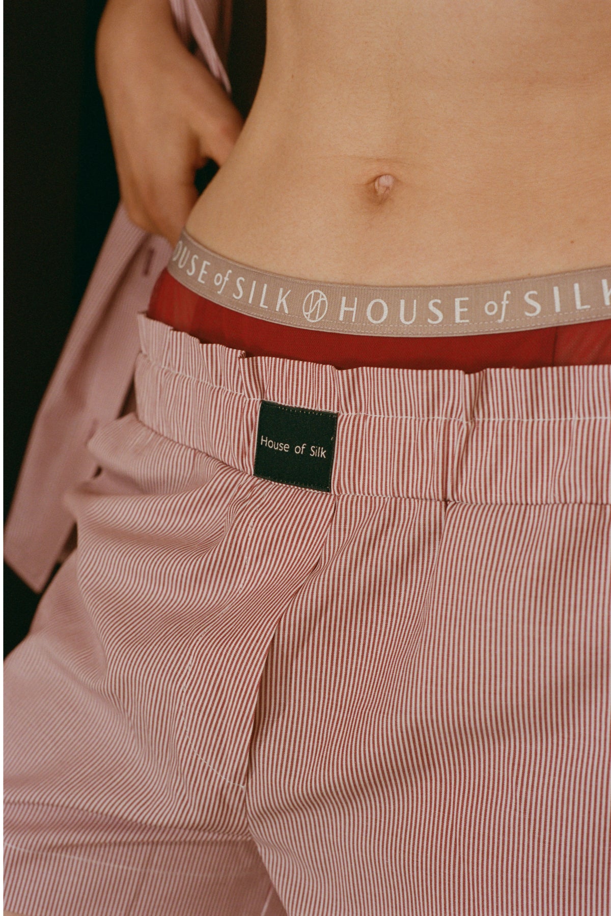 - Şortun lastiğinin ortasında House of Silk siyah etiket detayı