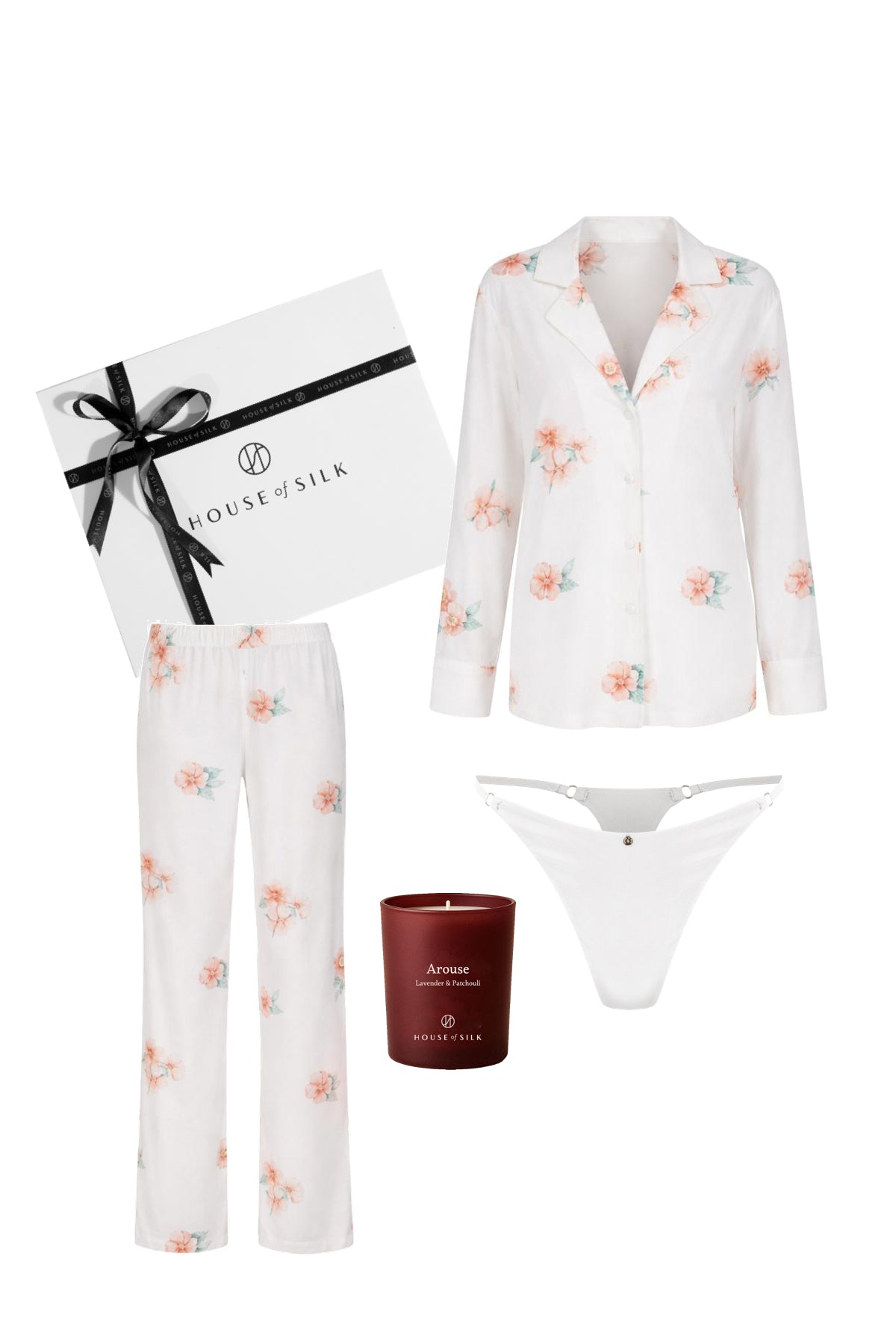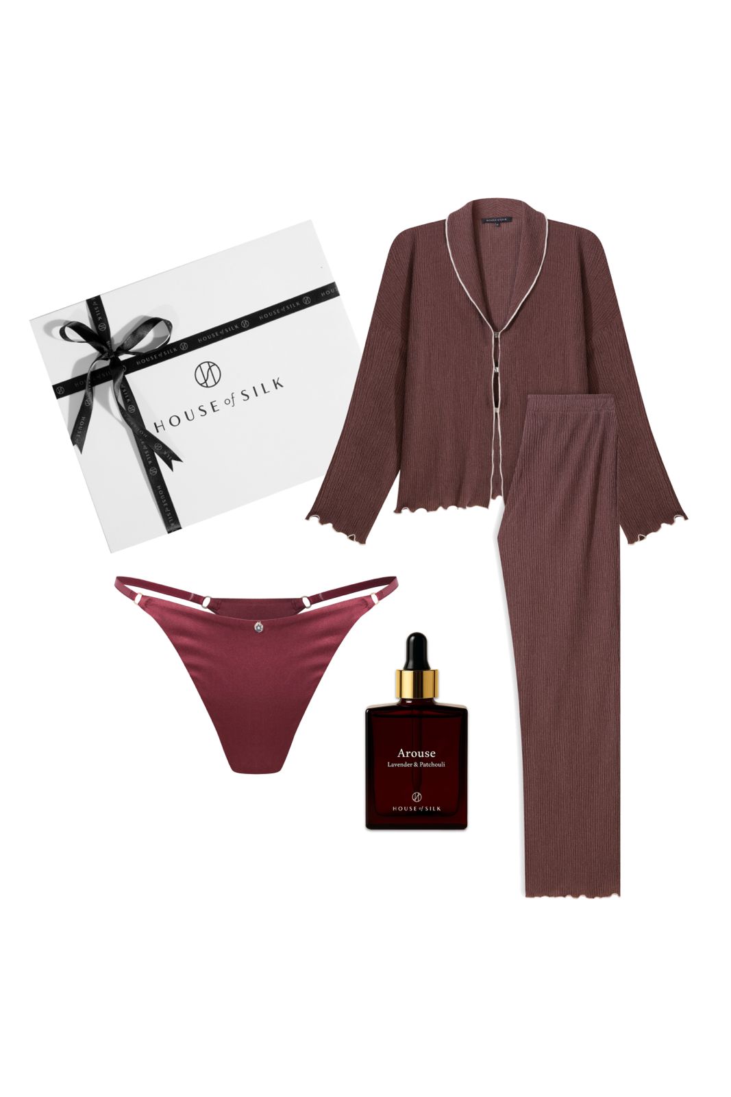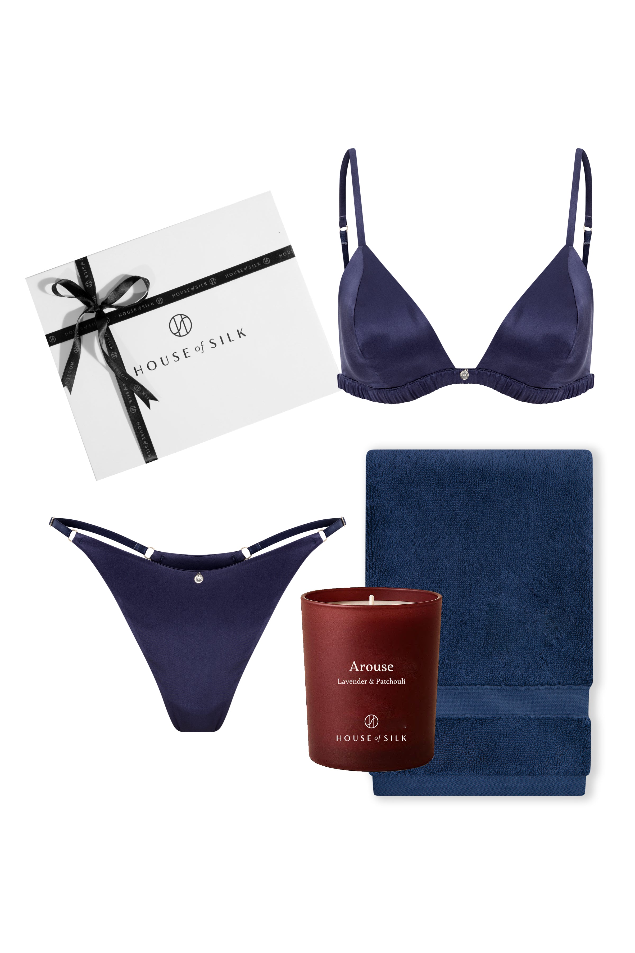 Audrey Babydoll akıcı siluetiyle anlara zarif bir çekicilik yaratırken İpek Üçgen Tanga minimal kesimi ve ipeğin yumuşacık dokusuyla duyusal bir dokunuş sağlıyor. Arouse Vücut Yağı, ten ve saçta hafif bir bakım sağlayarak, hissi ve dokuyu tamamlıyor.