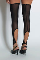 Charlotte Tül Çorap, şeffaf tül dokusuyla bacak hattını zarifçe öne çıkarırken, parmak ucu detayı ve açık topuk tasarımı sayesinde hem şık hem işlevsel bir kullanım sunar. Arka kısmındaki fiyonk dokunuşu romantik bir görünüm yaratırken, bacak boyunca uzanan ince şerit dantel çorabın siluetini tamamlar.