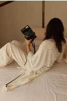 Cloud 9 Hediye Seti'nde Monroe Pijama Takımı ve Monroe Sabahlık, yumuşak dokuları ve akışkan formlarıyla bir araya geliyor. Hafif kumaşı tenle temas ettiğinde neredeyse yok hissi yaratırken, kontrast biye detayları tasarıma incelikli bir denge ekliyor. Birlikte kullanıldığında uyumlu, zahmetsiz ve bütünlüklü bir ev giyim seti oluşturur.