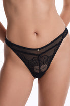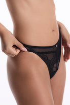Raye Tanga, ön bel kısmındaki transparan tül ve ağ bölgesine kadar uzanan zarif dantel detayıyla şıklığı öne çıkarır. Raye Sütyen ile birlikte etkileyici bir görünüm sunar.