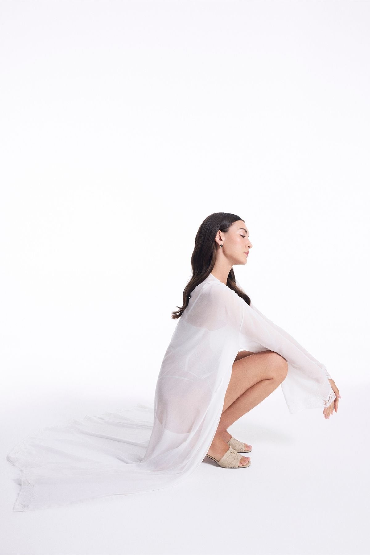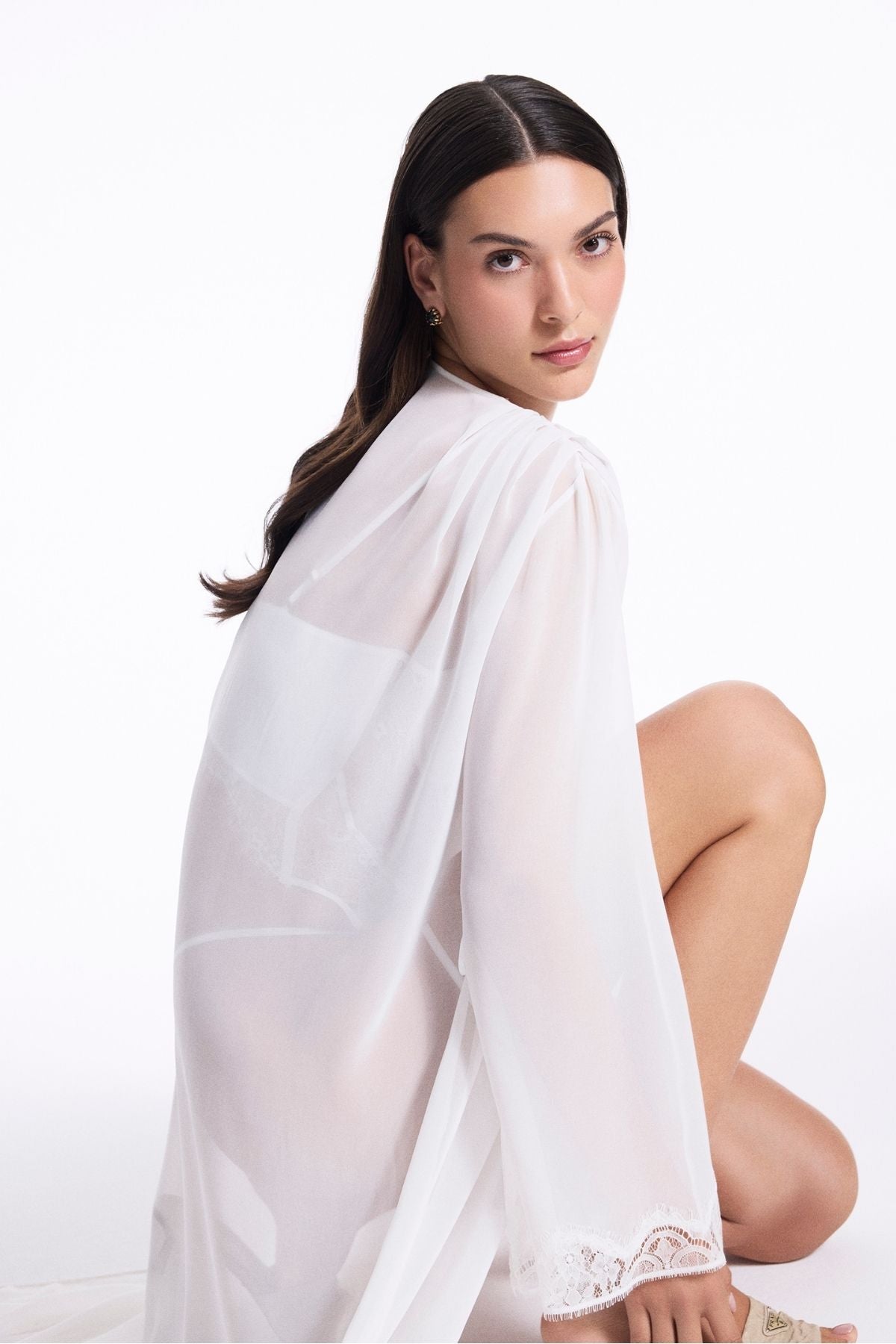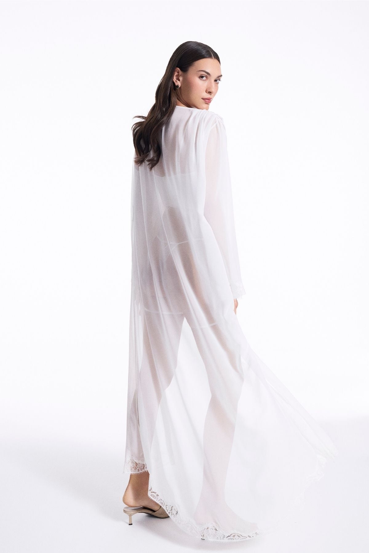 Uçuşan şifon kumaşı, uzun kesimi, etek ve kol uçlarındaki dantel detaylarıyla her hareketinize zarif bir akış katar.