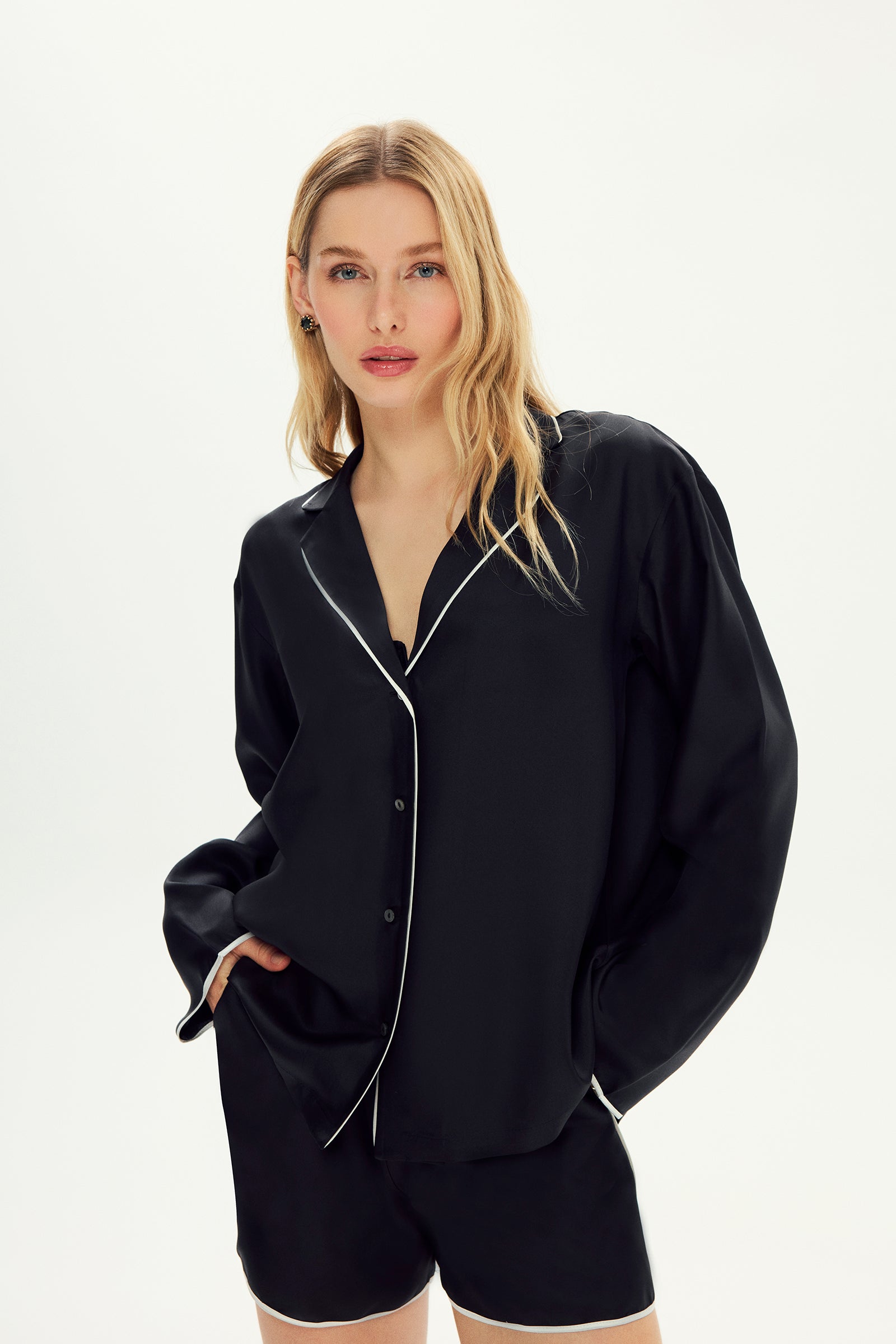 İpek Twill Adira Biyeli Şort Pijama Takımı, oversize kesimiyle hem evde hem de dışarıda rahatça tercih edebileceğiniz şık bir seçenek. Eforsuz şıklığı ve yumuşak ipek dokusu ile günlük stilinizin vazgeçilmezi olacak. Zarif biyeli detayları, bu rahat seti şıklığınızdan ödün vermeden kullanmanıza olanak tanır.