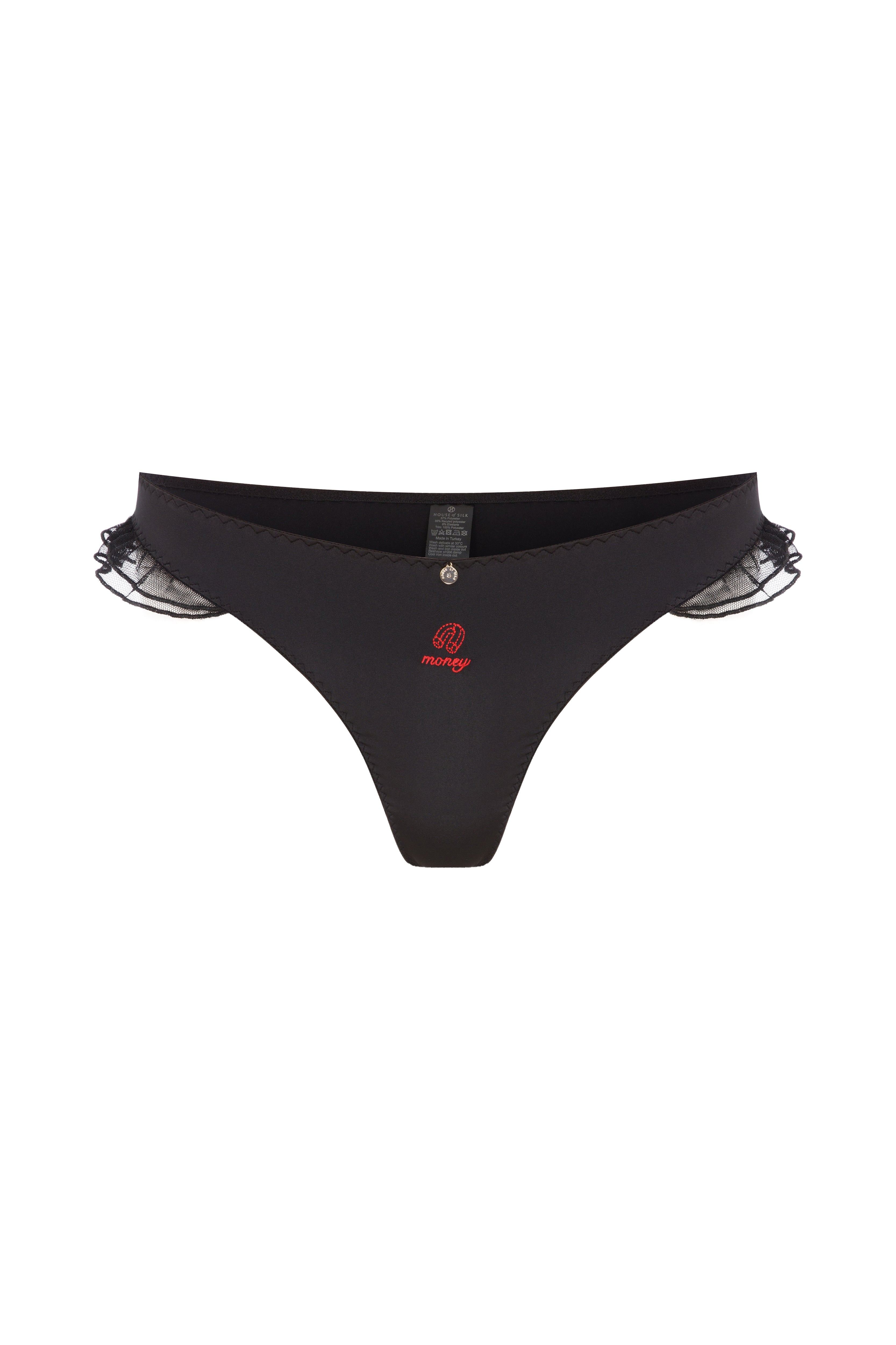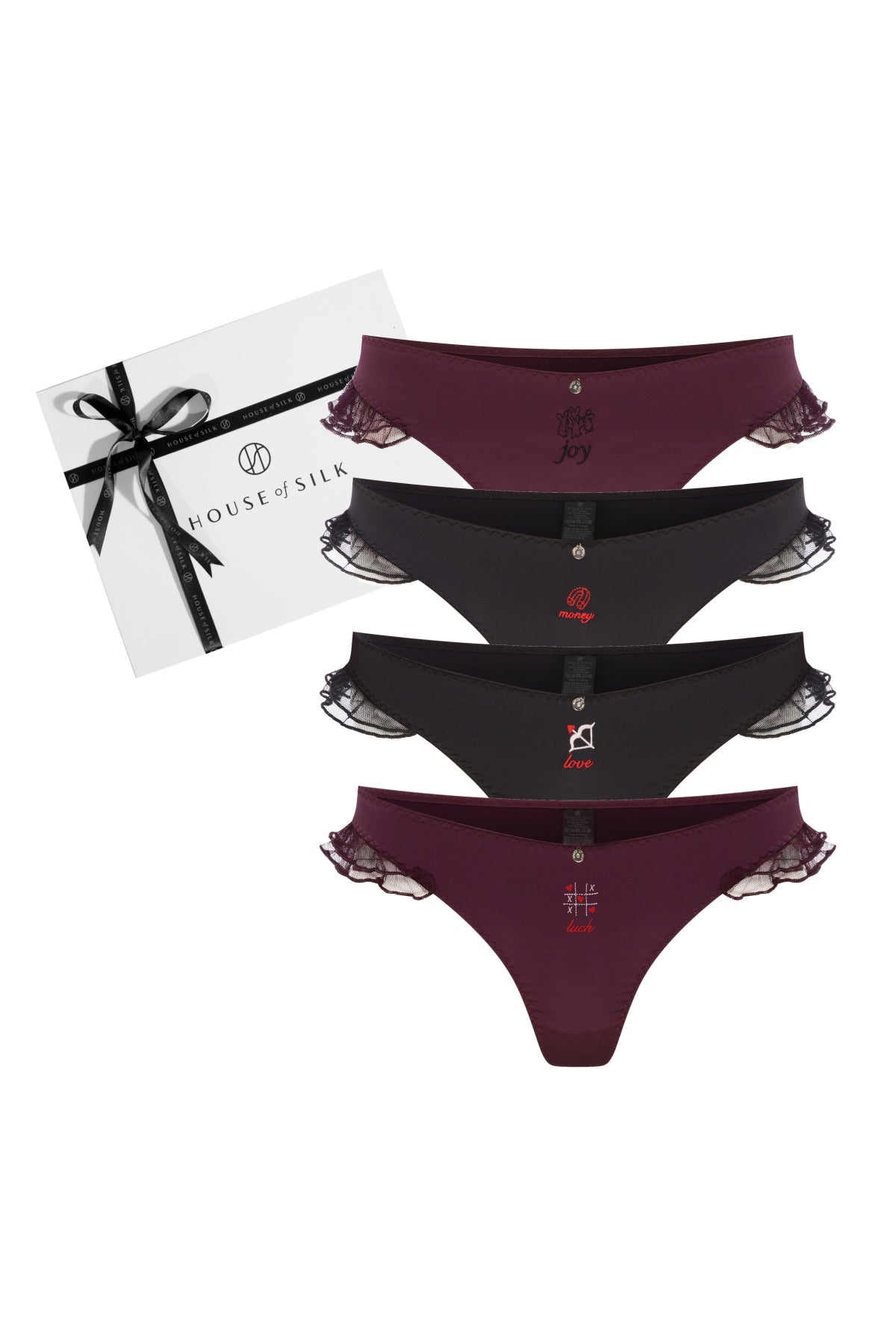 Joy, Luck, Money ve Love nakışlı tangalar, küçük bir dokunuşla günün modunu seçmek için tasarlandı.