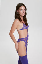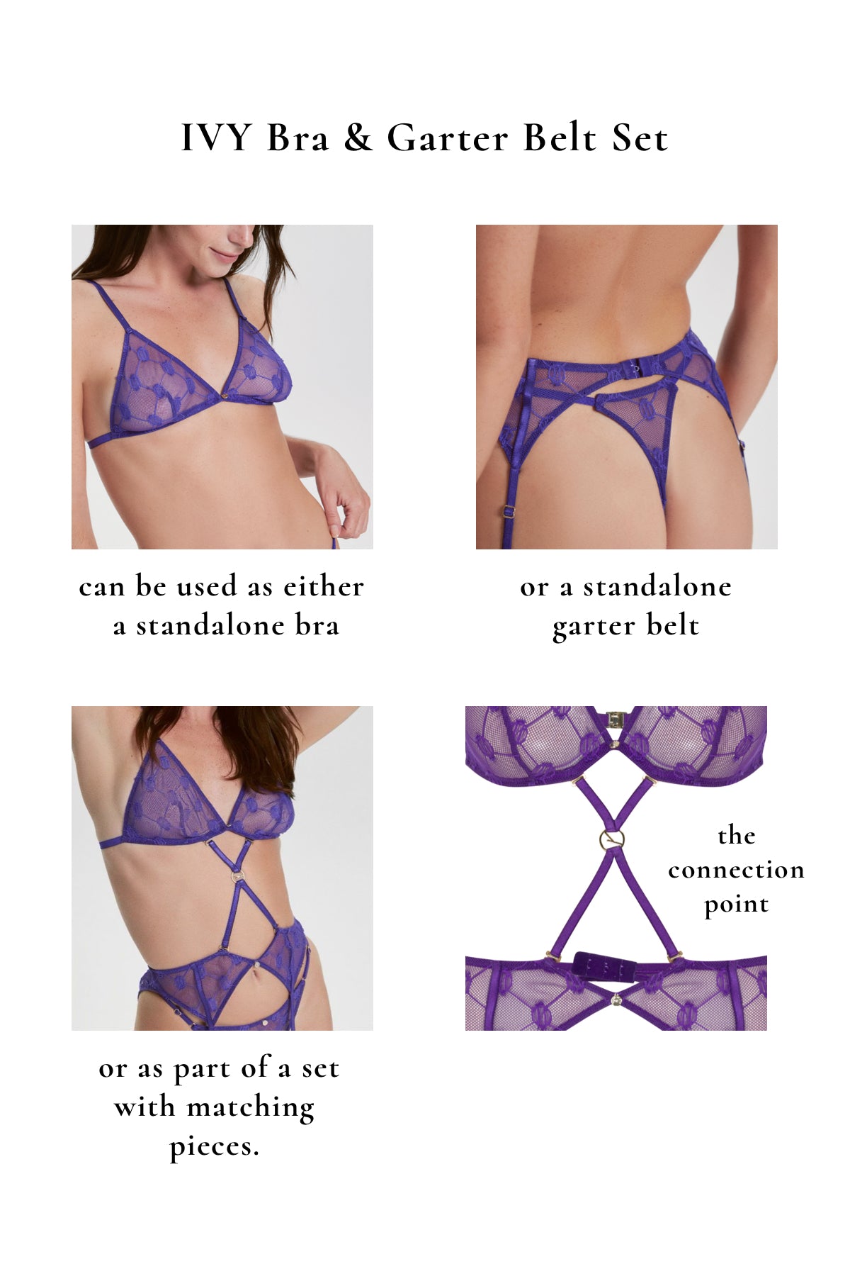 Muhteşem ikili! Cazibeyi ve lüksü teninizde Ivy Üçgen Sütyen Jartiyer Takım ile hissedin! Aşkın rengi mor renk ile dantelin çekici dokusu sizi büyüleyecek.