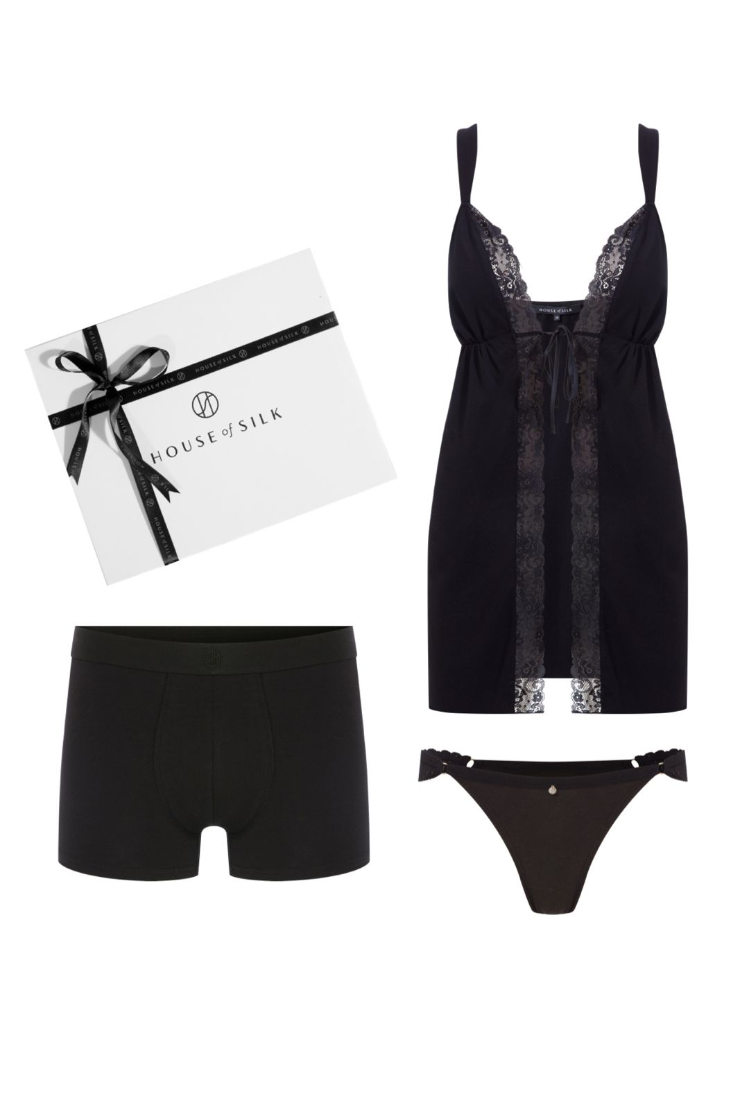 Micro Modal Extra Yumuşak Boxer Siyah yumuşacık dokusuyla gün boyu rahatlık sunarken; Mia Babydoll ve Tanga Seti, aynı konforlu dokuyu paylaşan, bedene nazikçe uyumlanan parçalar olarak seti tamamlıyor.