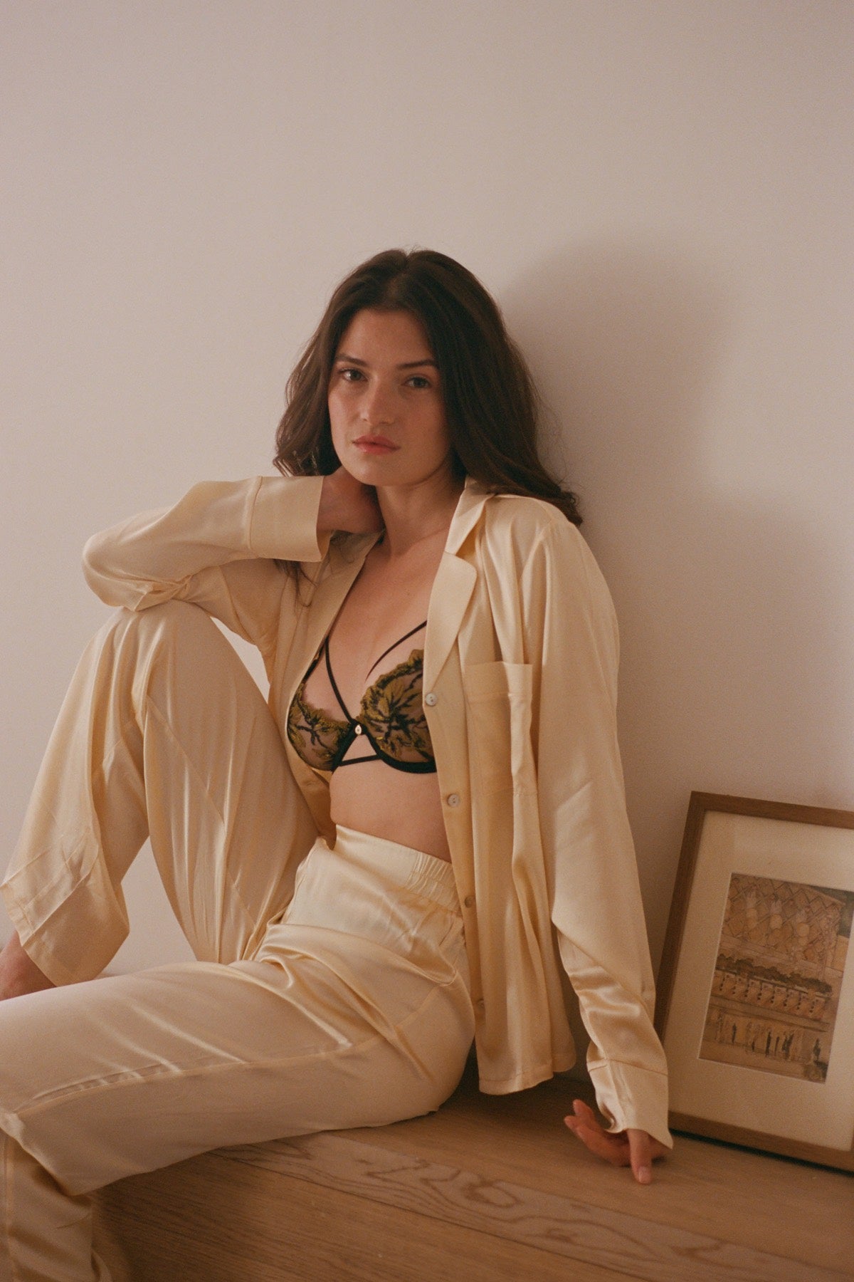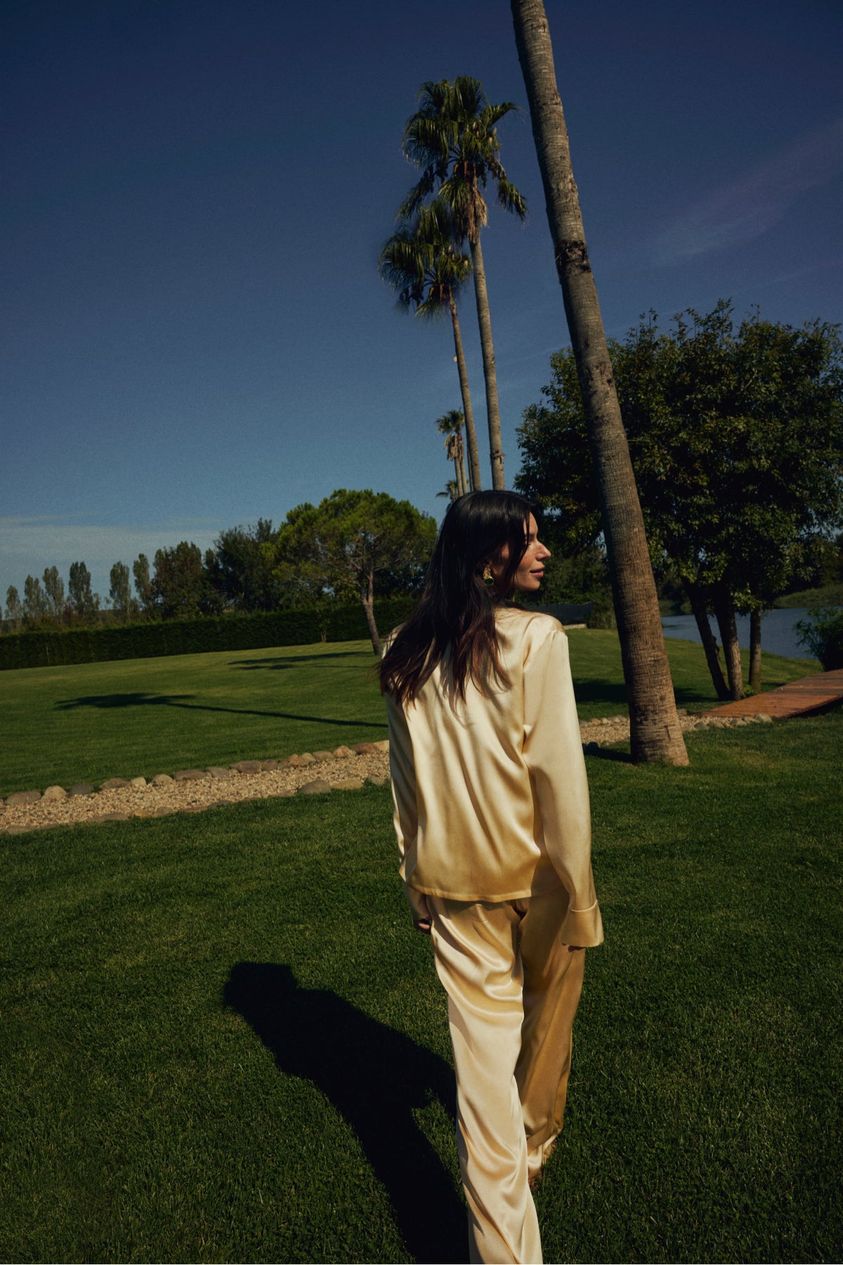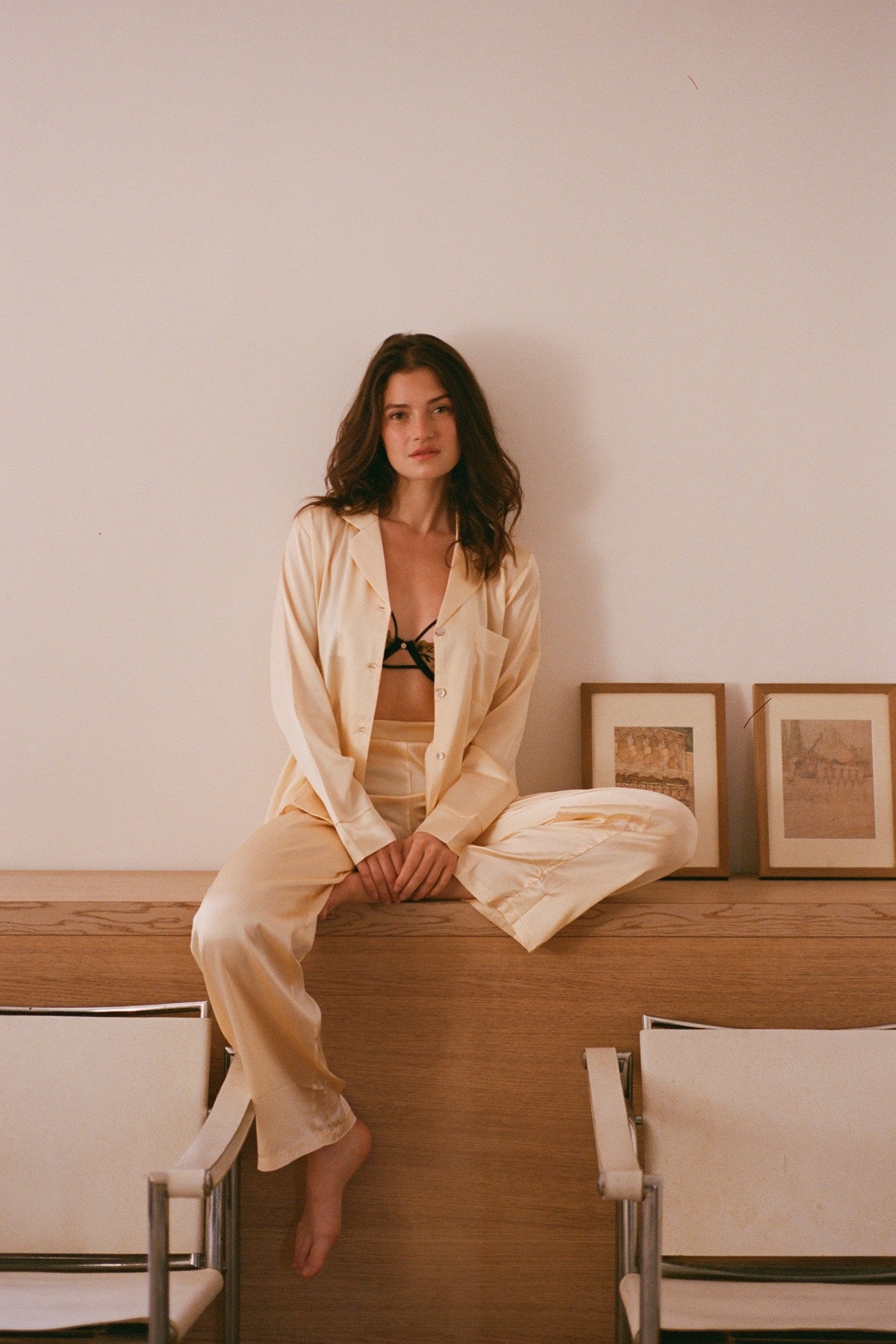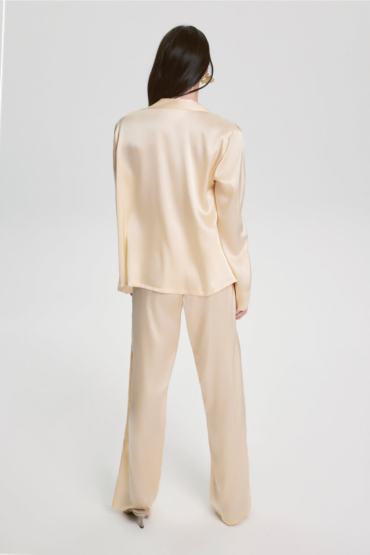 Our Luxurious Silk Pajama Set with its elegant, stylish and timeless lines! The luxurious silk long-sleeved Vanilla colored Pajama Set includes an image suitable for both your street and home style.