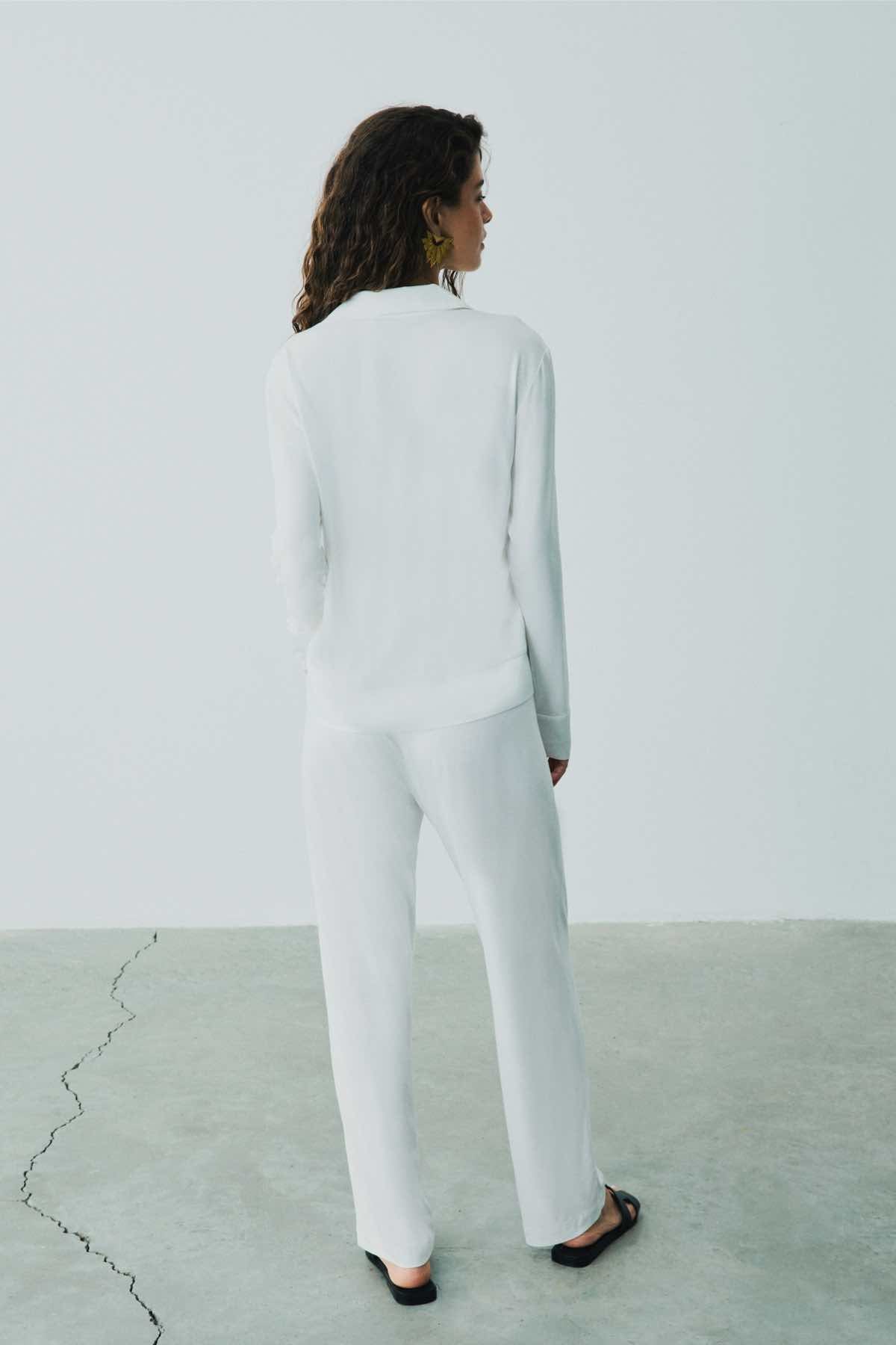 In this collection, which also includes masculine and bold lines, House of Silk continues to strengthen its line of women who derive their self-confidence from their own strength, with leather details, longitudinally striped cotton shirts, and monogrammed viscose suits.