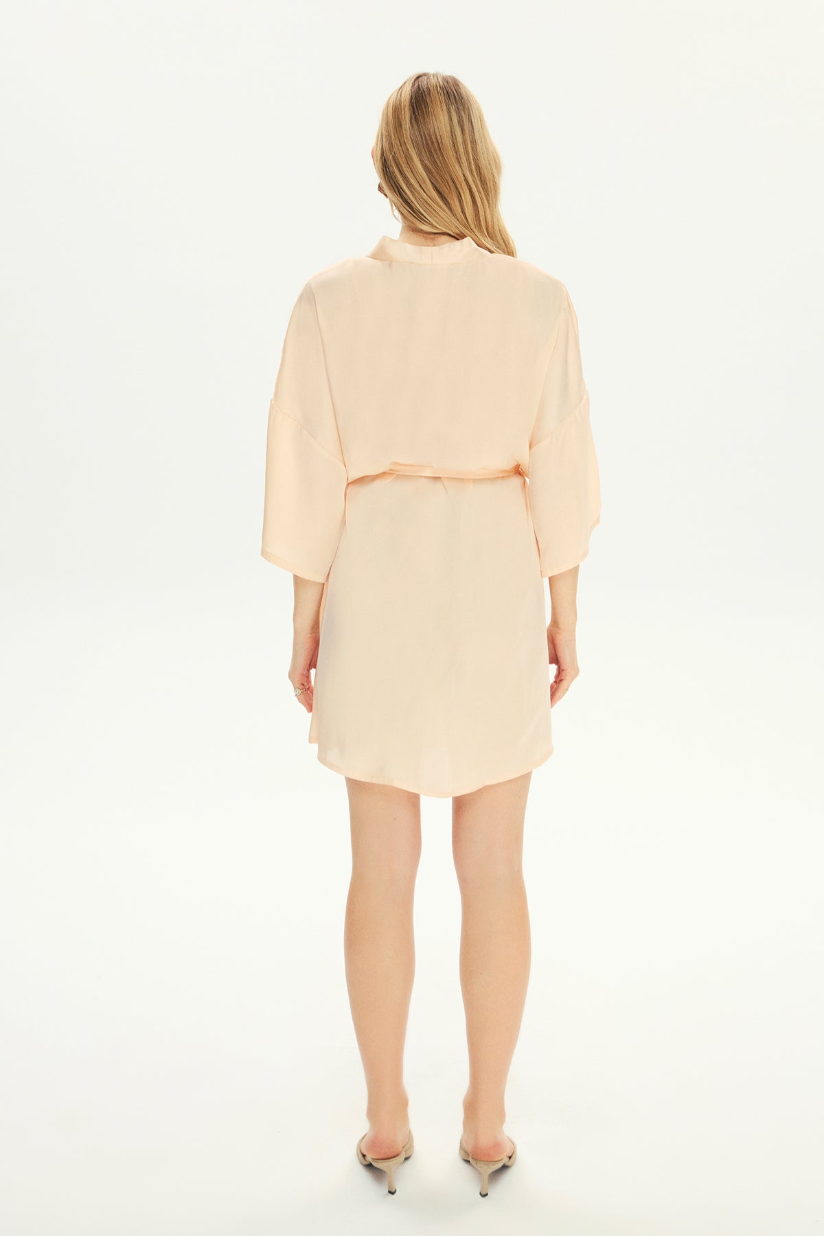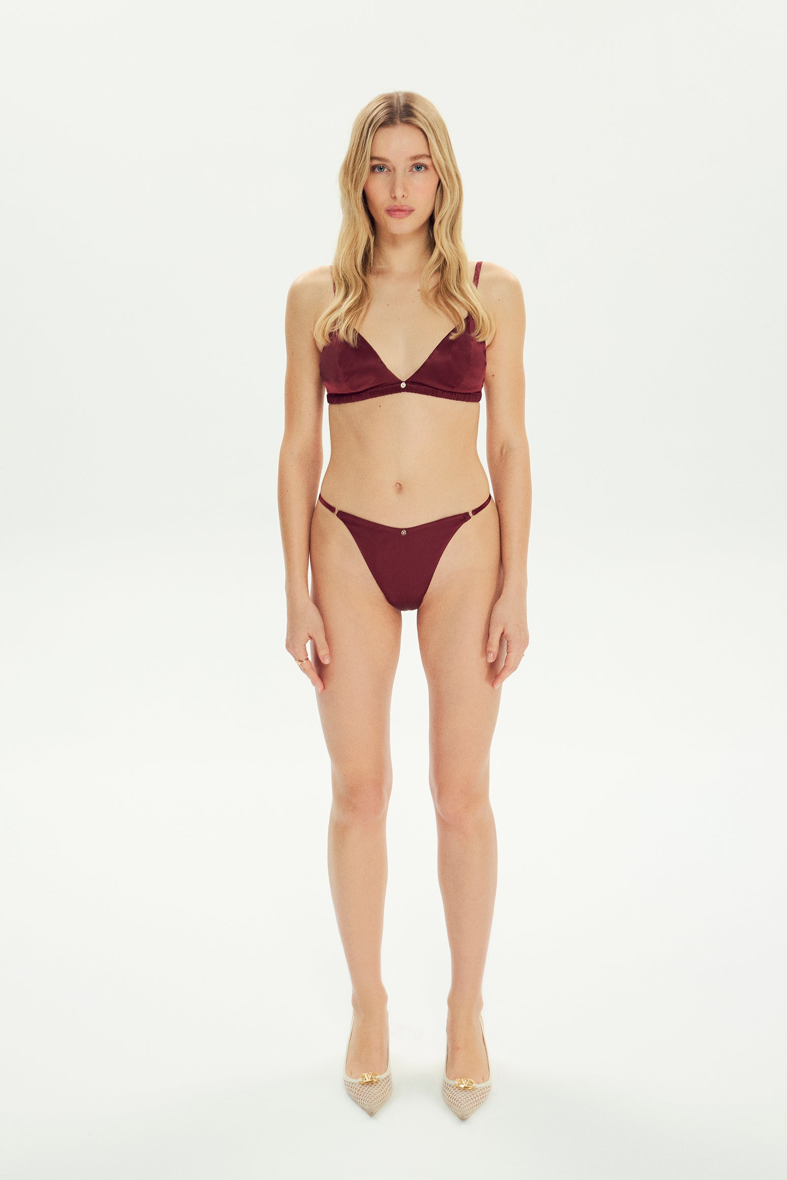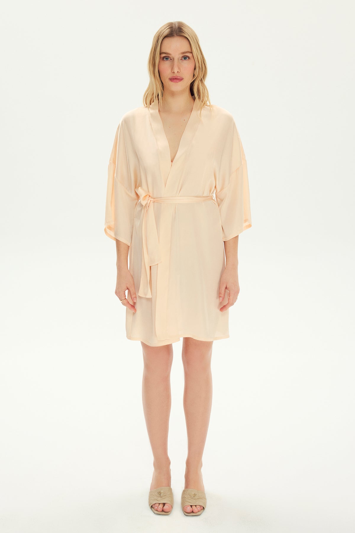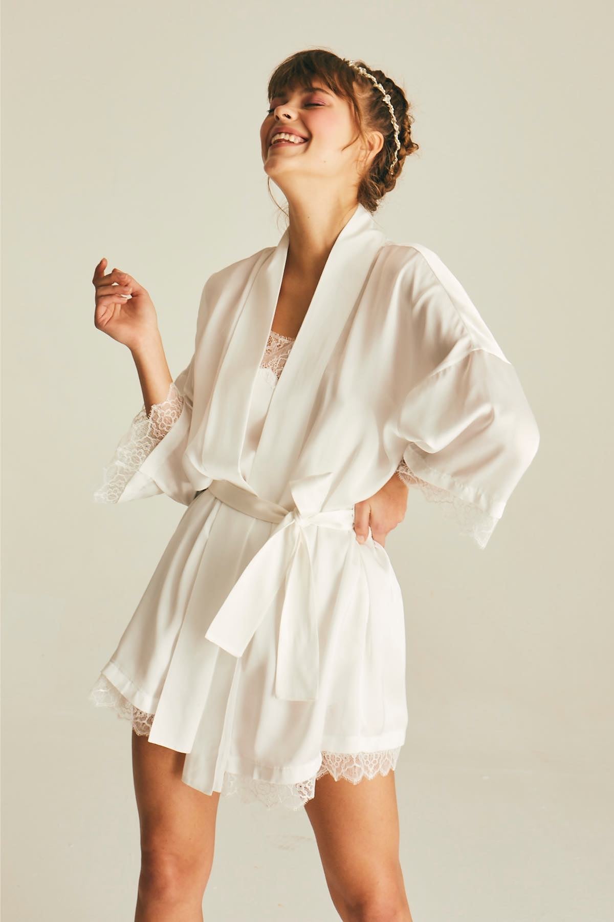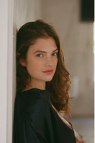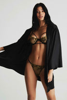Our silk Gabriel dressing gown has a kimono cut and angel sleeve details. You can complete your Gabriel silk dressing gown with our black silk Freida dress or our triangle black silk Soft Bra and thong set.