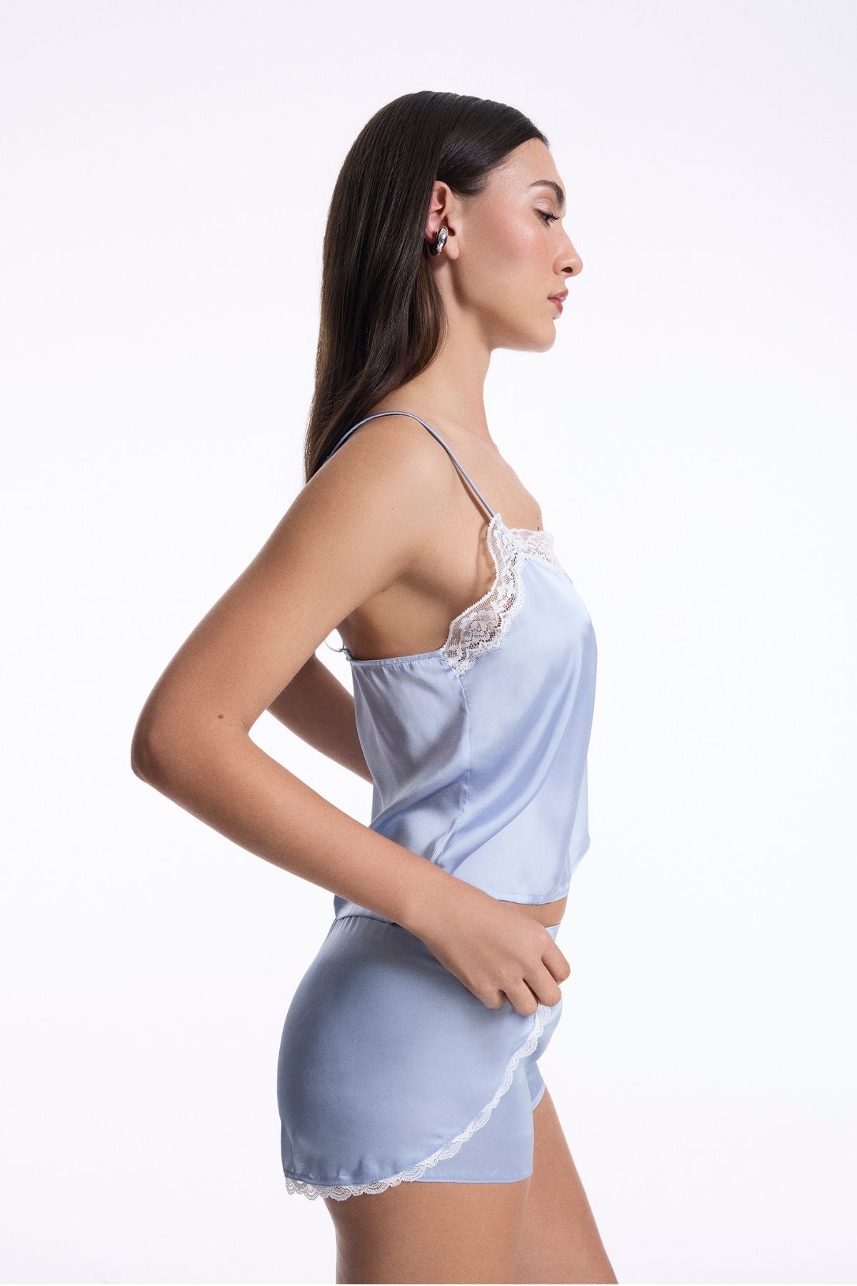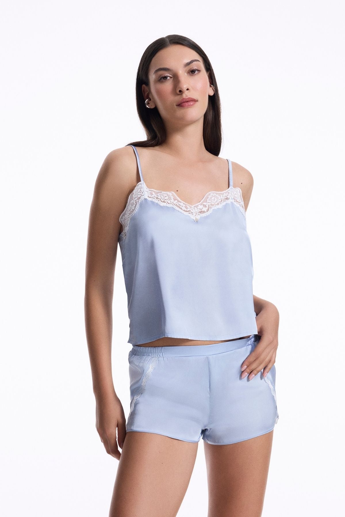 Dekolte kısmında zarif dantel detayıyla öne çıkan bu askılı üst, ayarlanabilir askıları ve bel kısmındaki lastiğiyle mükemmel uyum sağlar. Ön belden arkaya uzanan dantel detayıyla şıklığı tamamlayan takımın göğüs kısmında, House of Silk taşı yer alır. Altı rahat şort formunda, hem şık hem konforlu bir görünüm sunar.